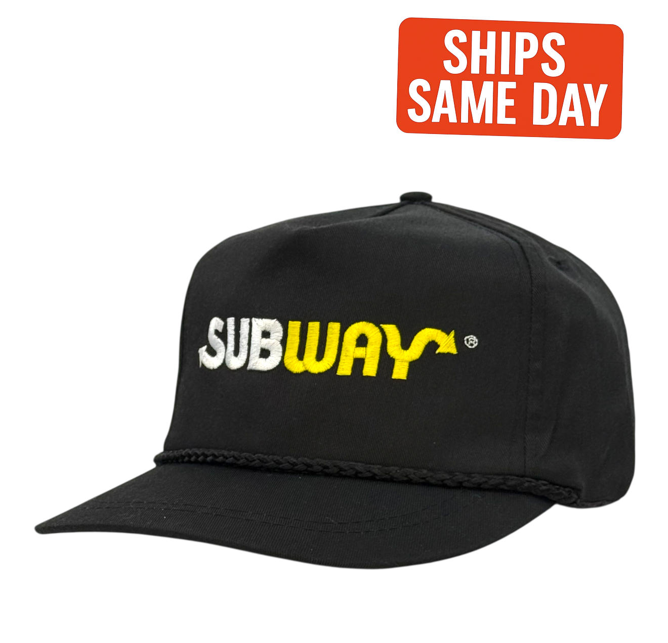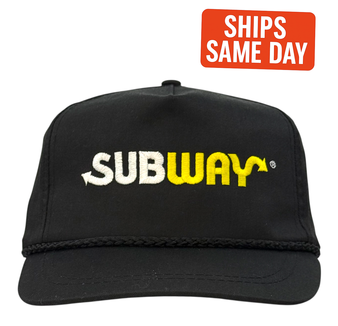 Made in the classic black rope-trim trucker style with embroidered yellow-and-white Subway logo, this cap captures the true 90s workwear look that modern reproductions can’t match.